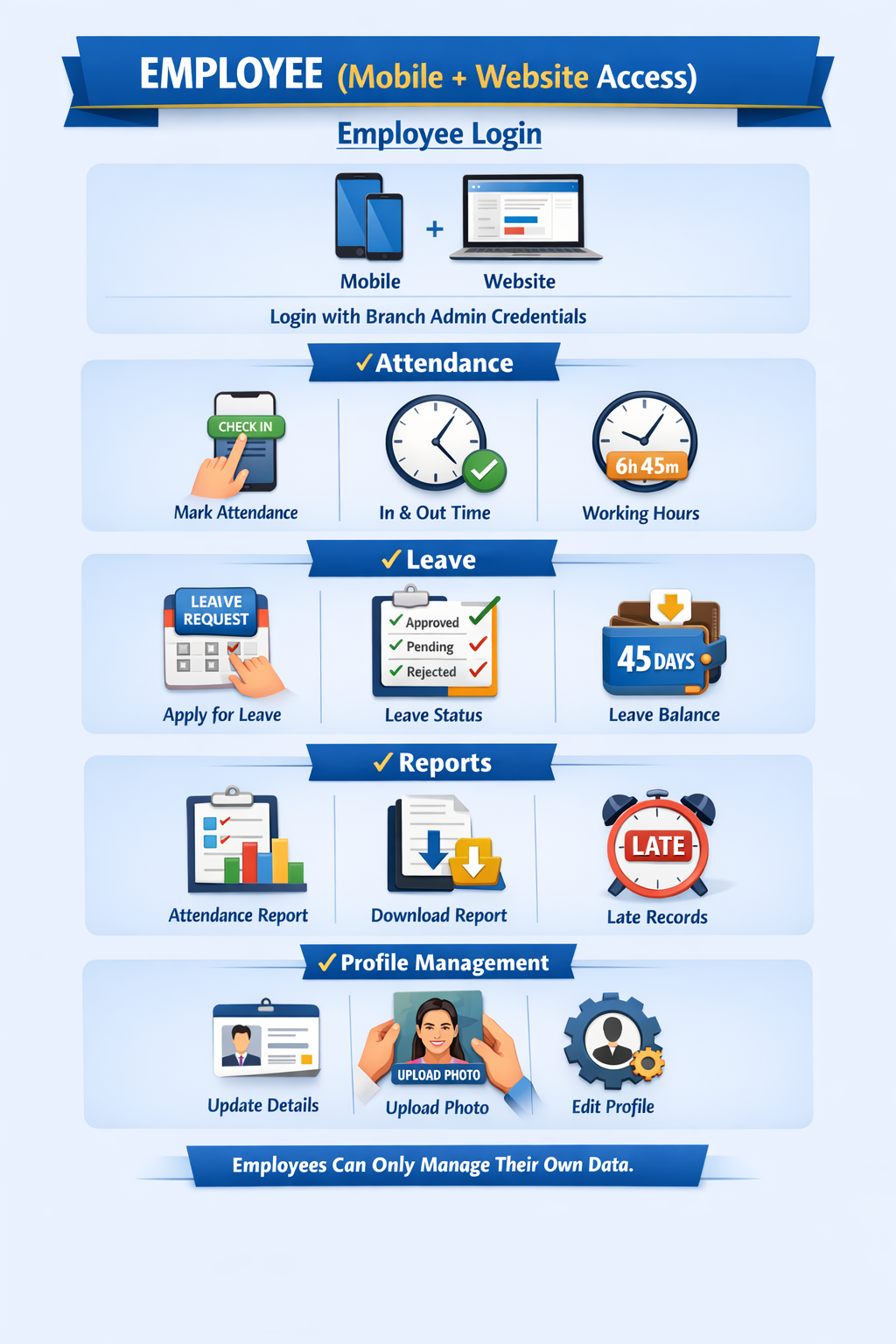 Trusted by businesses of all sizes, from small organizations to large enterprises, our scalable attendance management software grows with your business. Choose us to streamline attendance operations, improve workforce efficiency, and experience a smarter way to manage attendance.